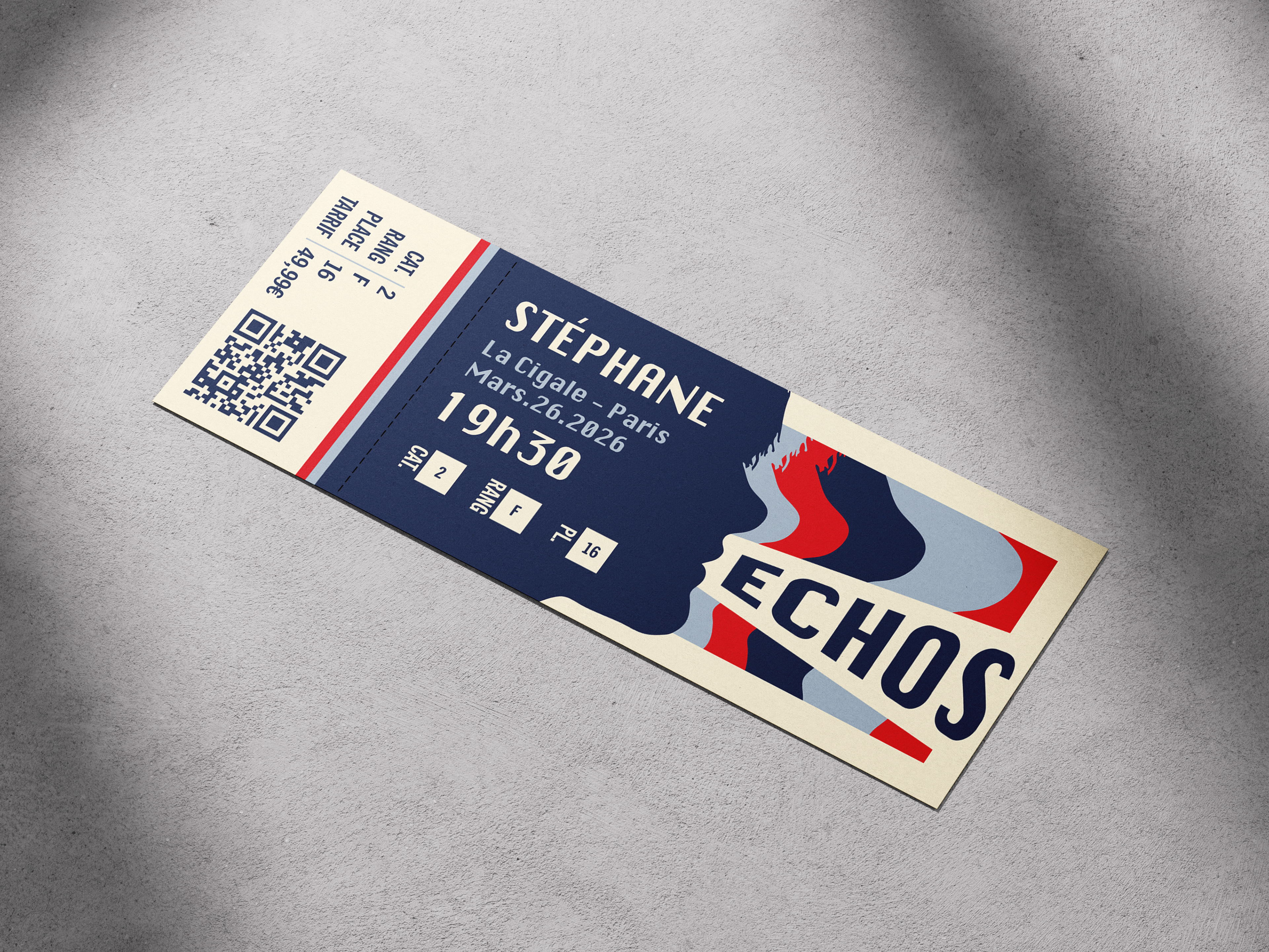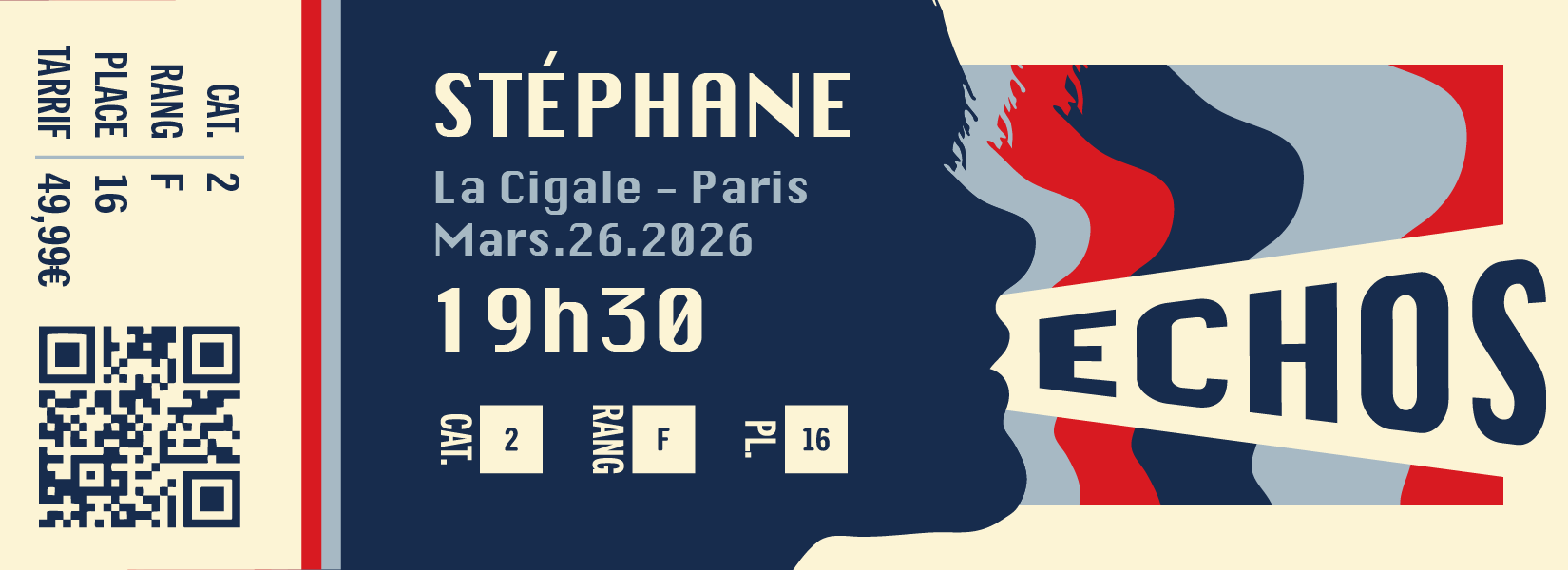 This poster advertises a concert for the french pop artist Stéphane, for her new album titled "Échos". In addition to the poster I also have a ticket and a tote bag design.