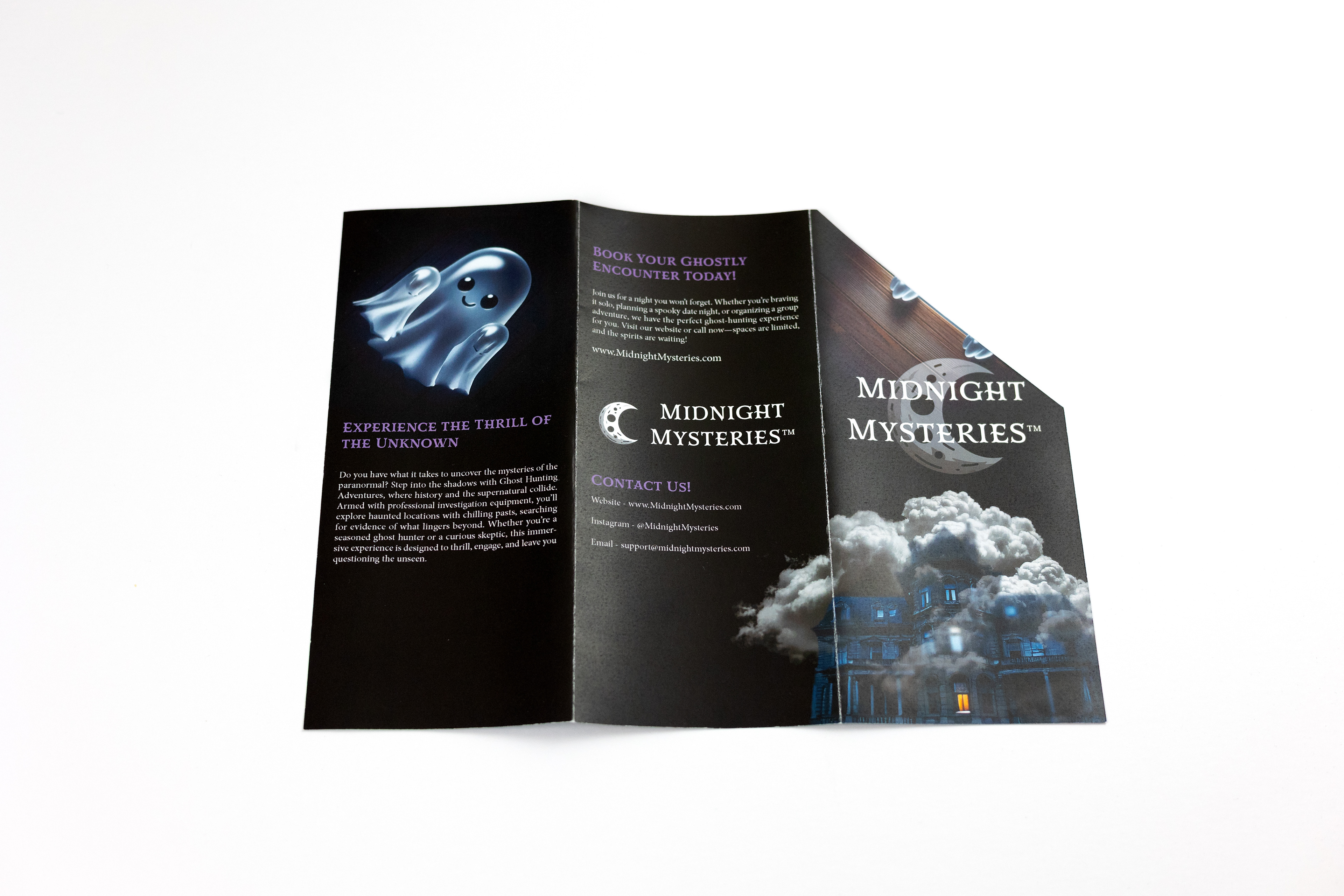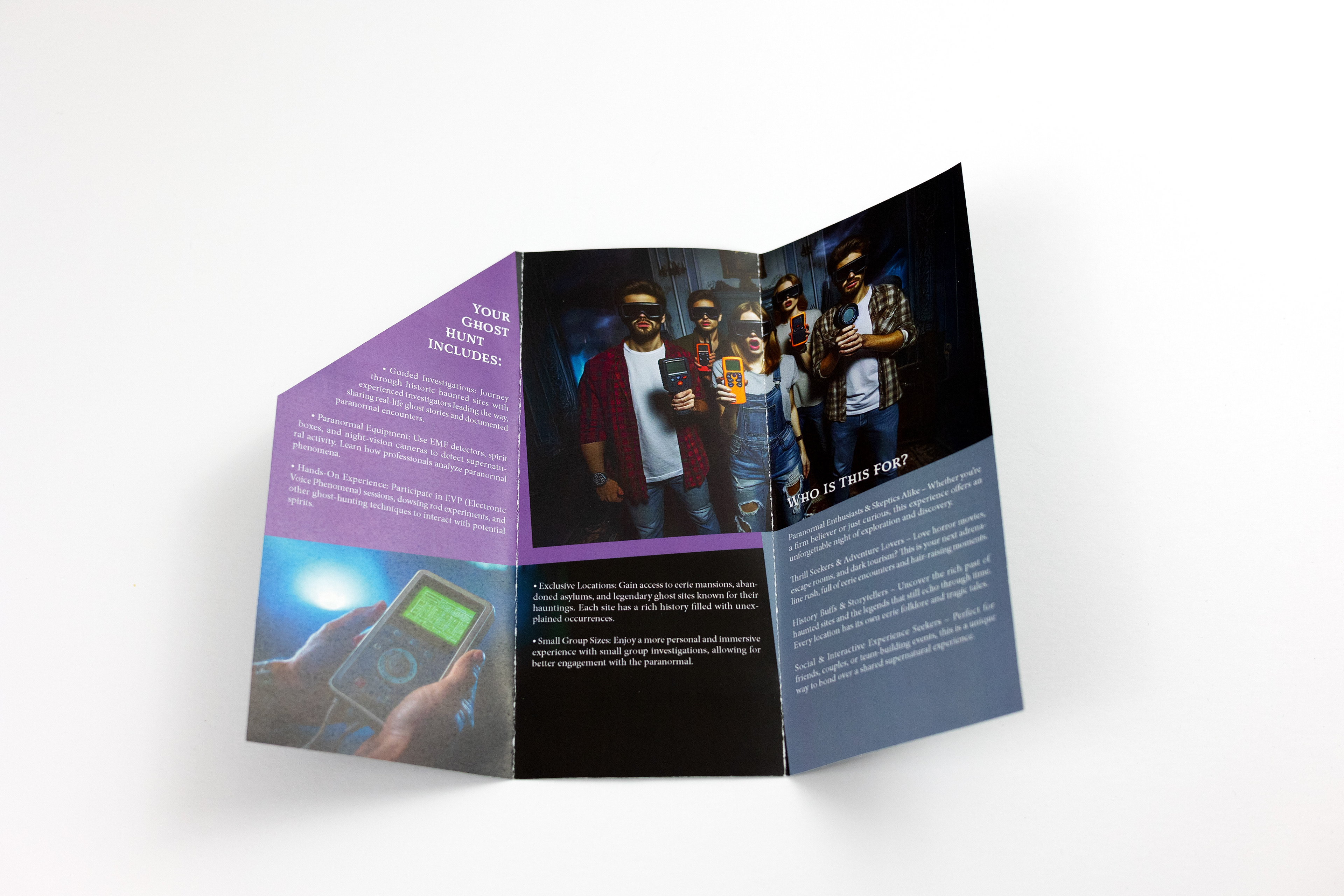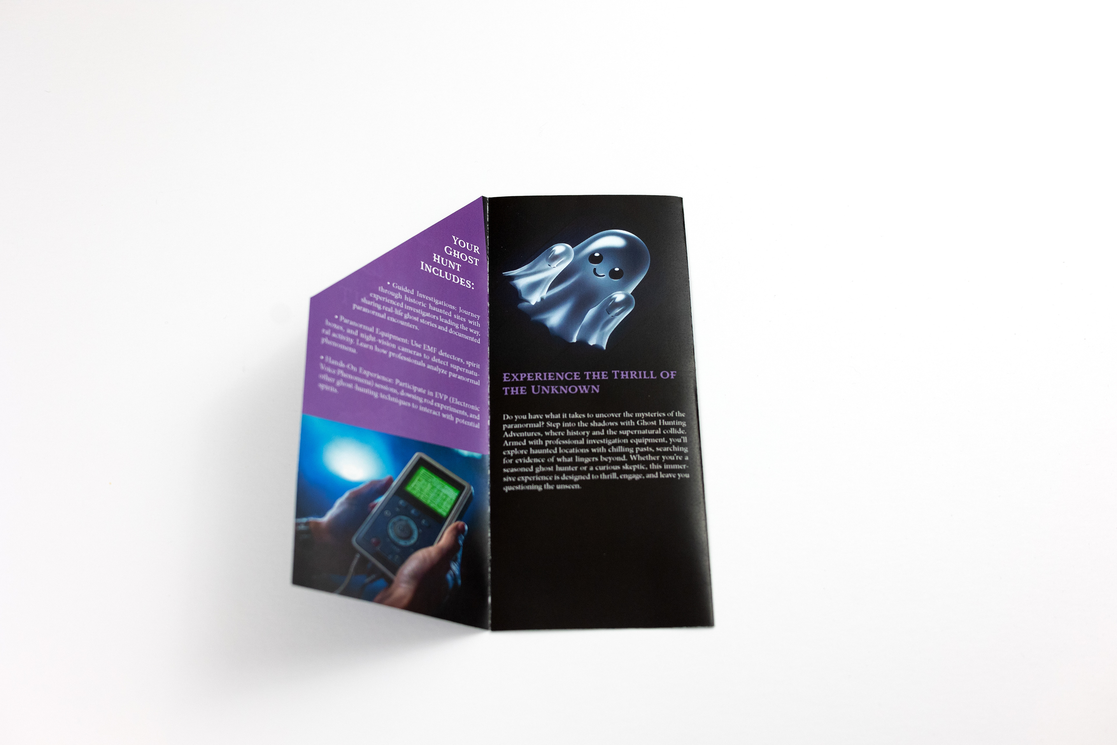 This brochure advertises a ghost hunting experience. On the cover is a friendly ghost peeking over a wall, and when the cover is opened the rest of the ghost is revealed. This interactivity invites people to open up the brochure to discover what is inside.