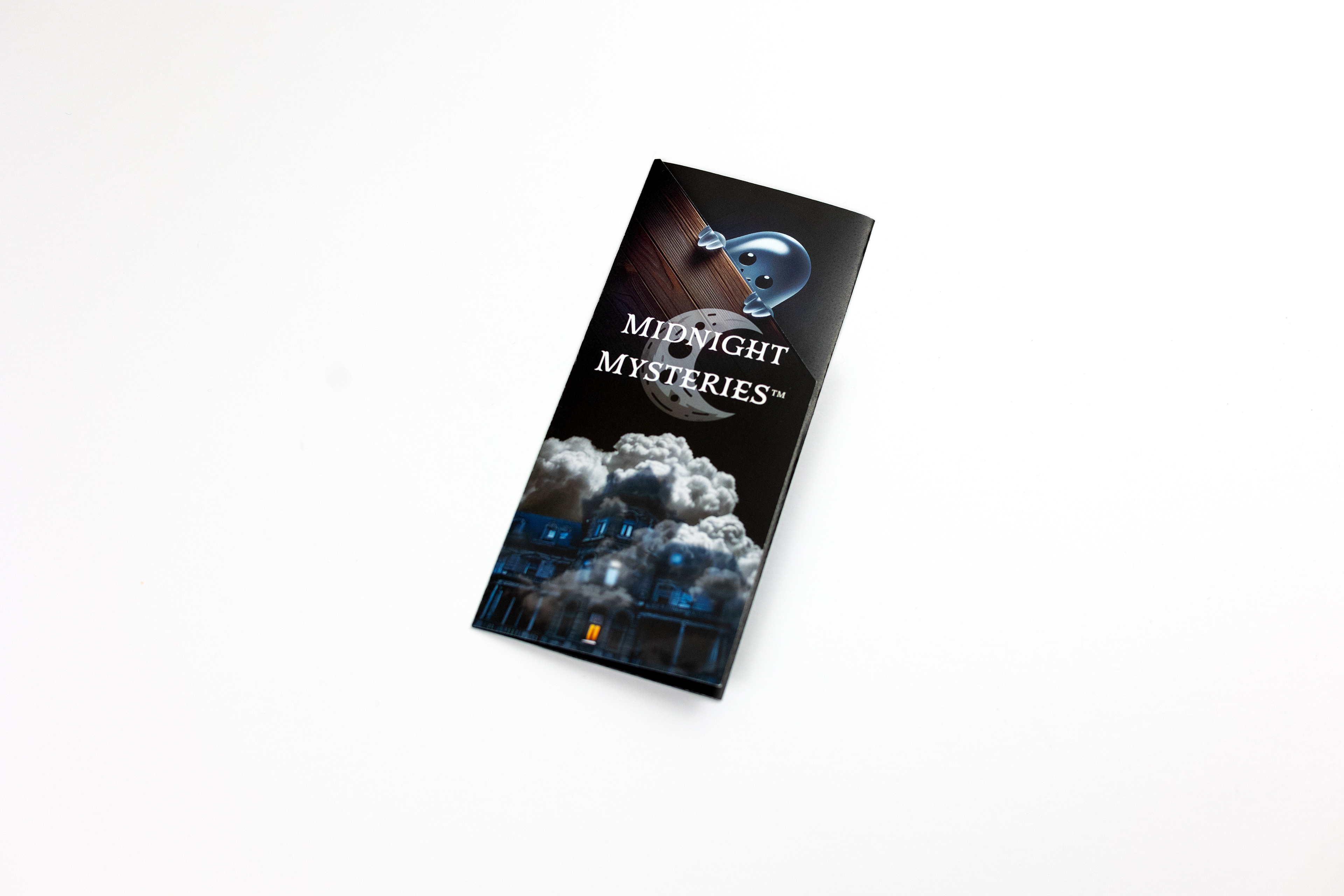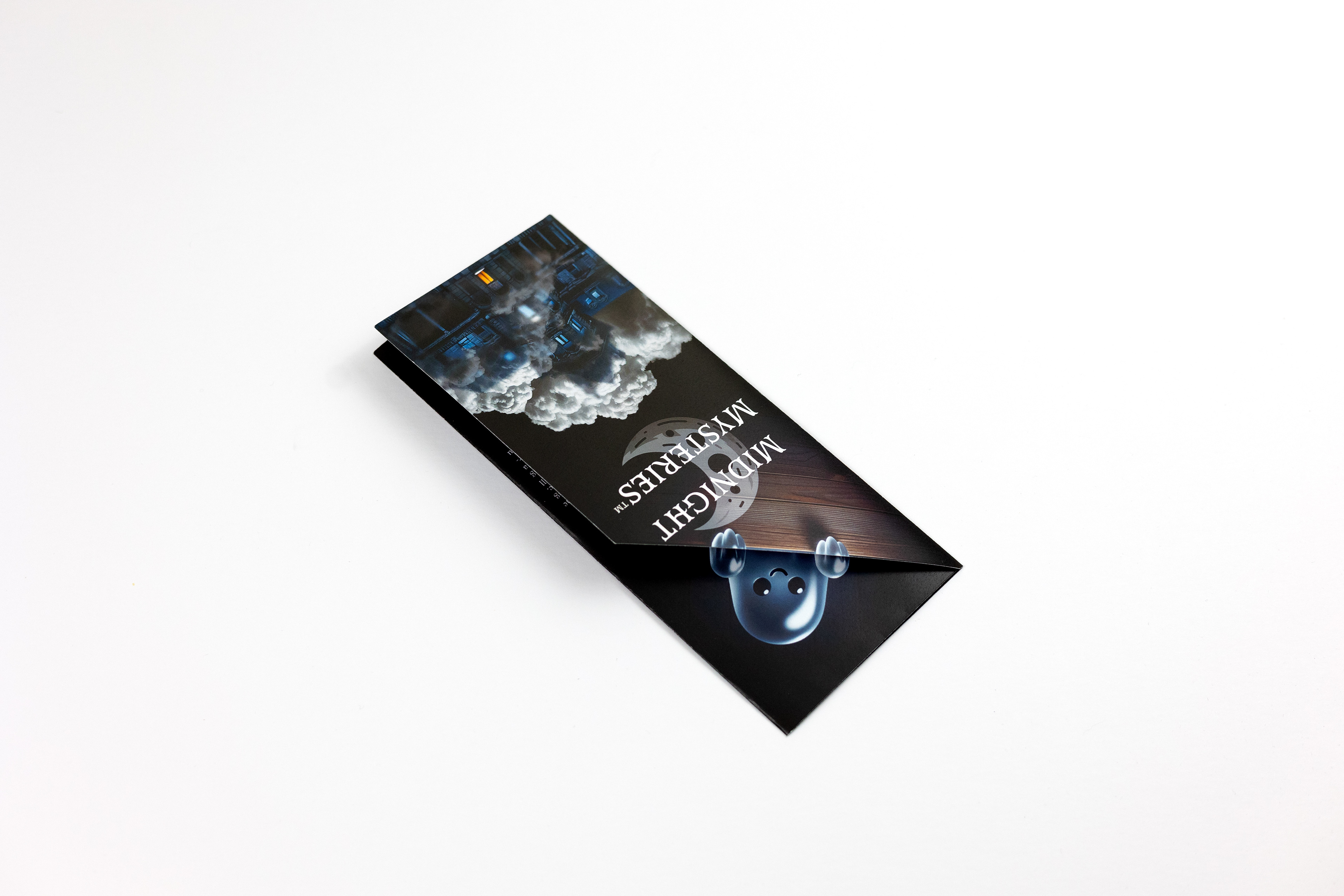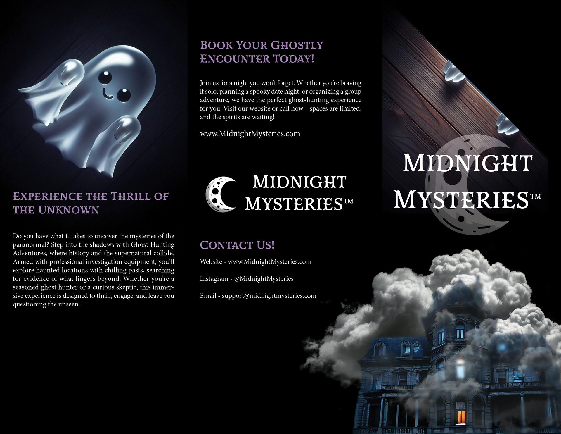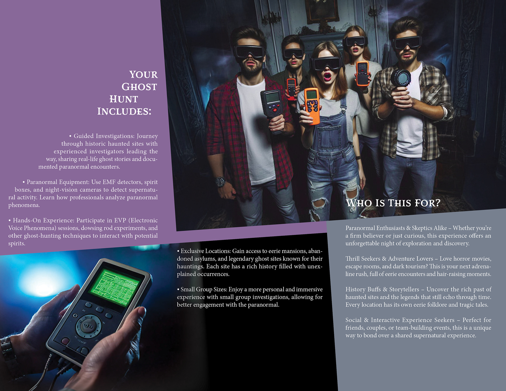 This brochure advertises a ghost hunting experience. On the cover is a friendly ghost peeking over a wall, and when the cover is opened the rest of the ghost is revealed. This interactivity invites people to open up the brochure to discover what is inside.