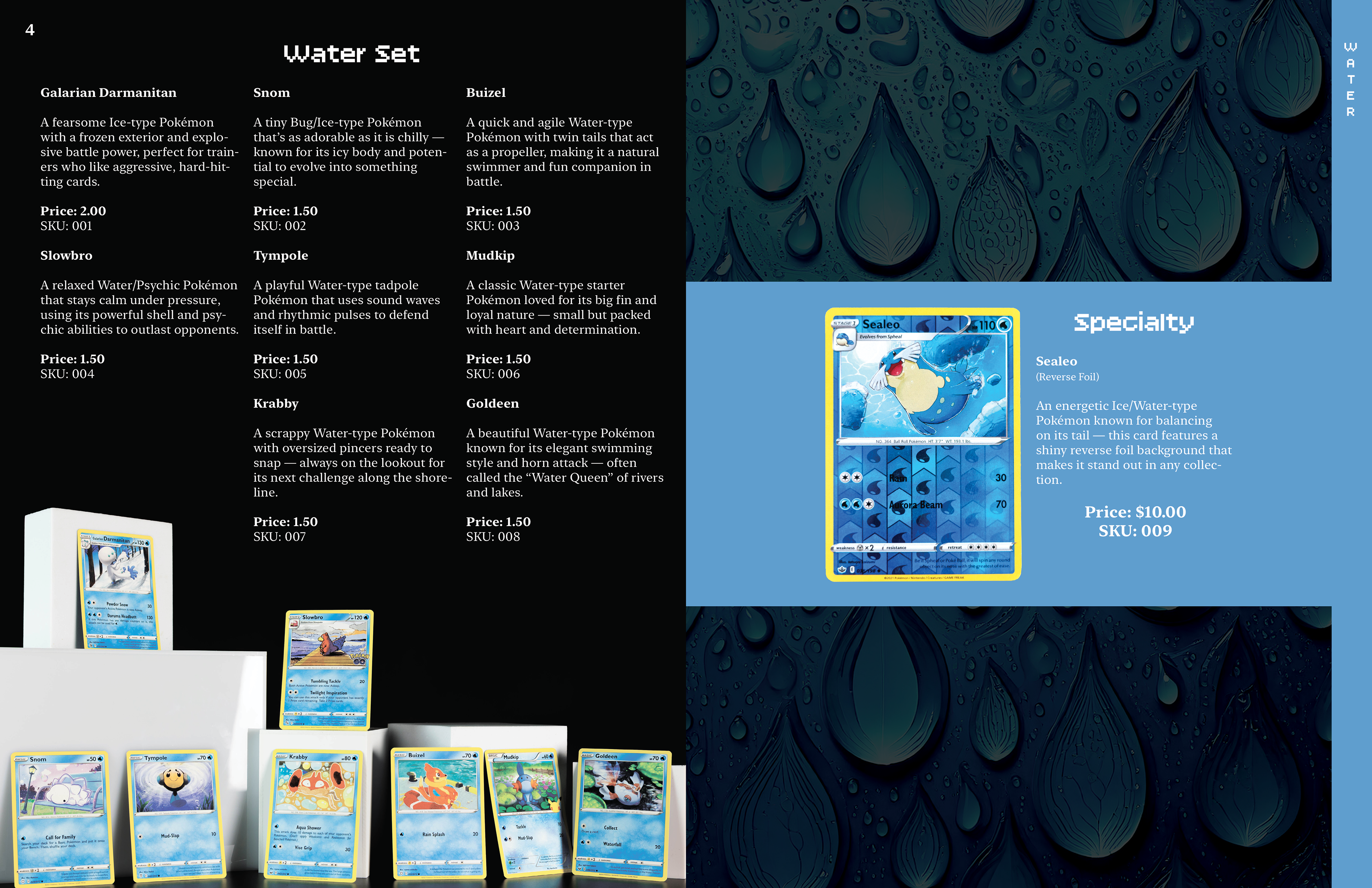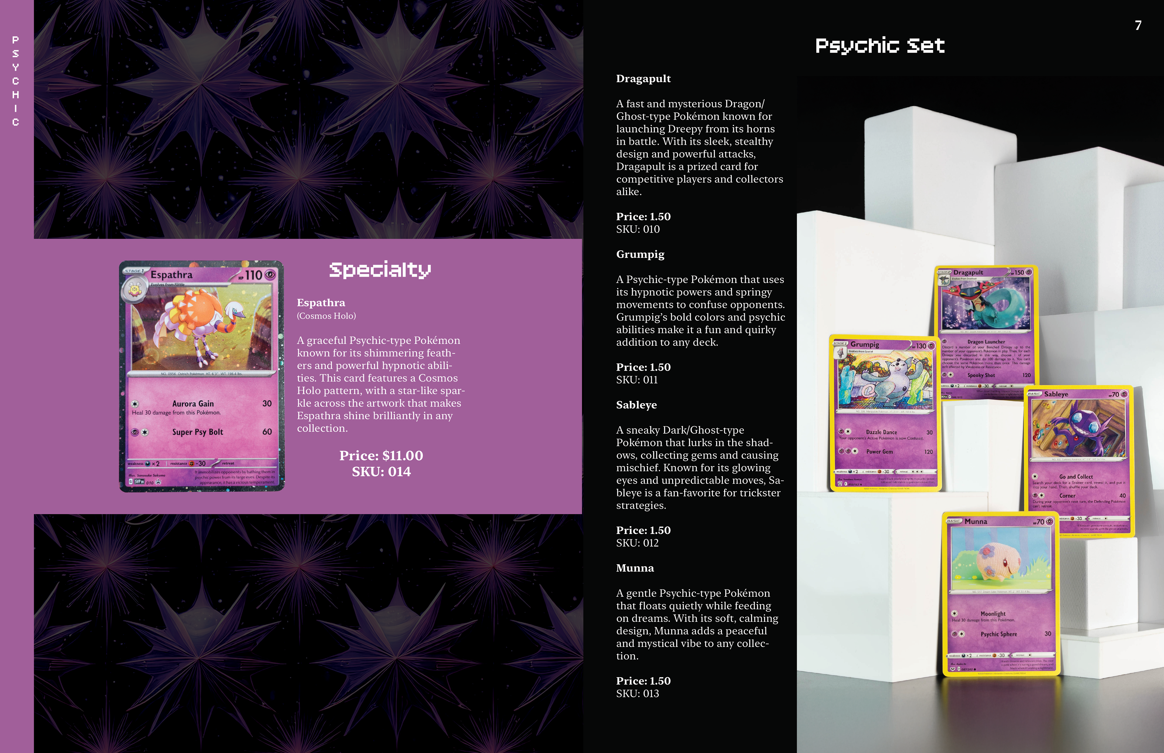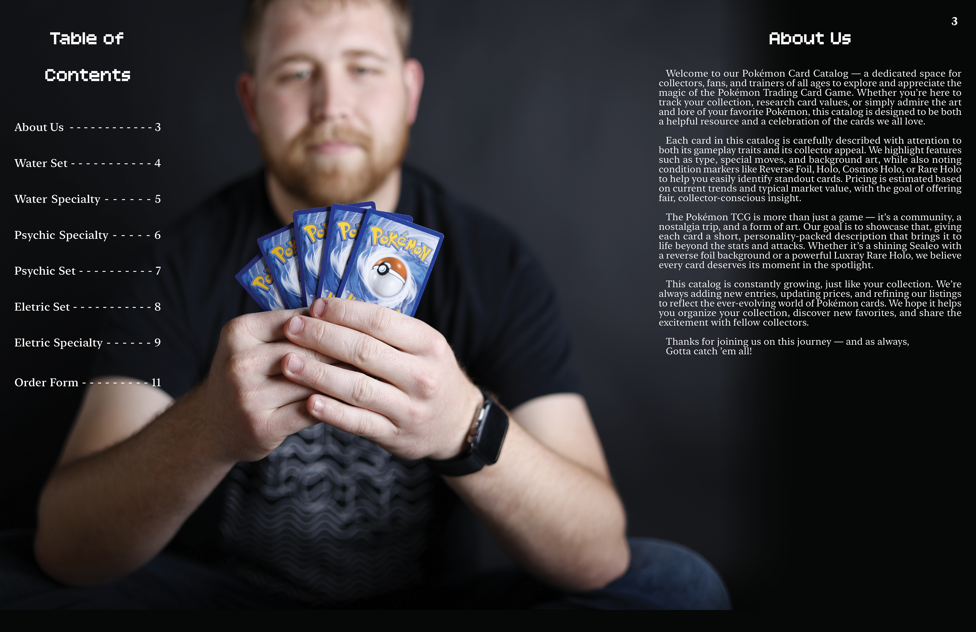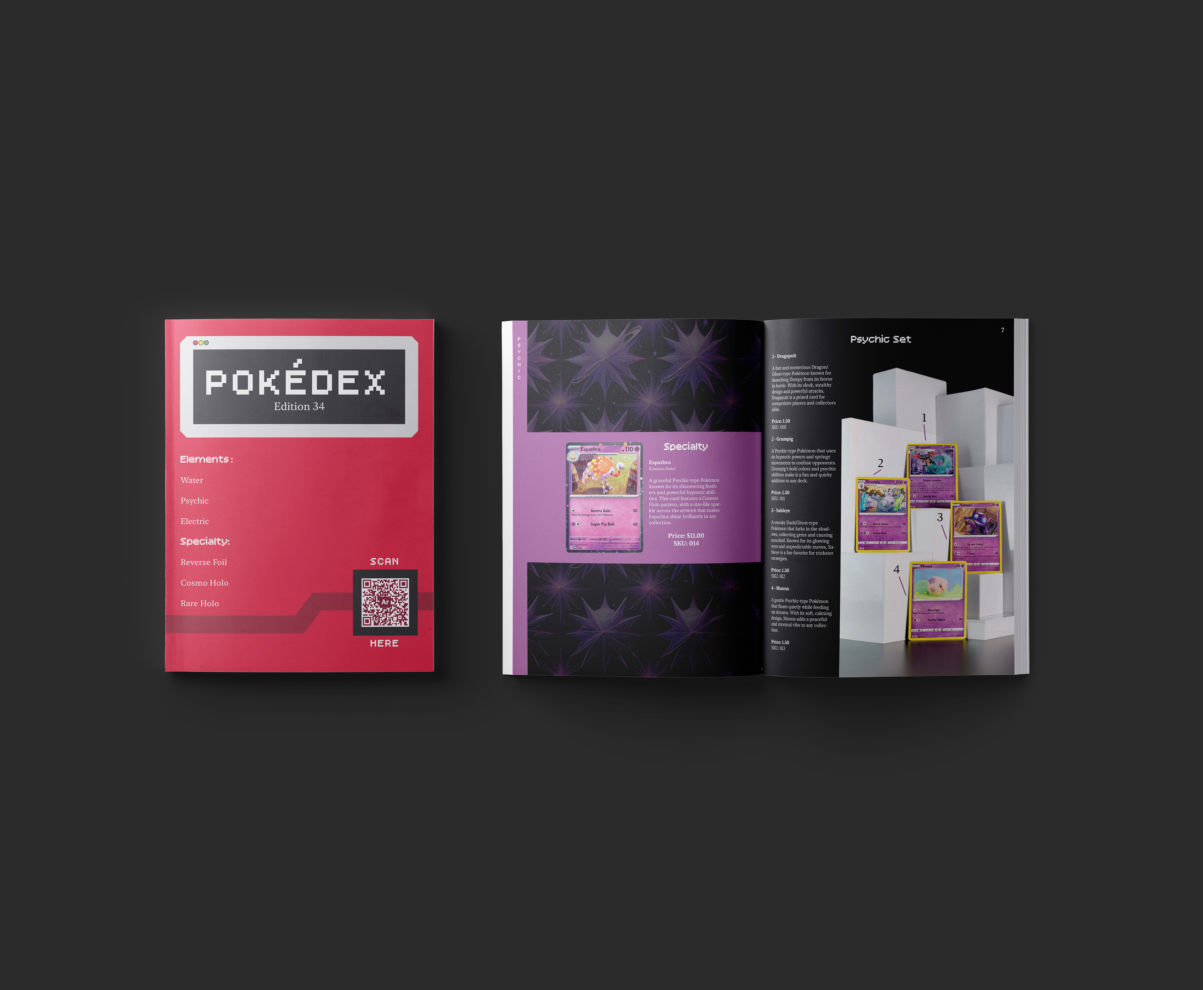 This catalog sells Pokémon cards through mail in orders. The design is made to be accessible to the mature collecting side of the card game as well as the younger audience. I designed the layouts as well as shoot the photography.