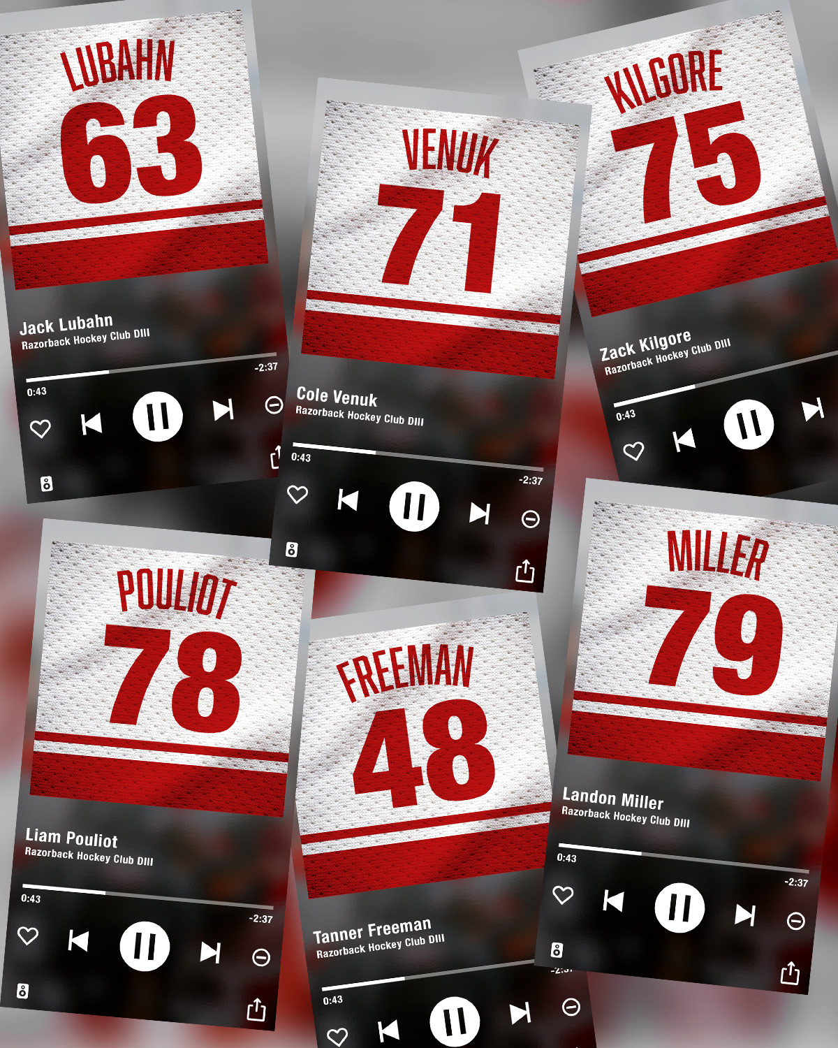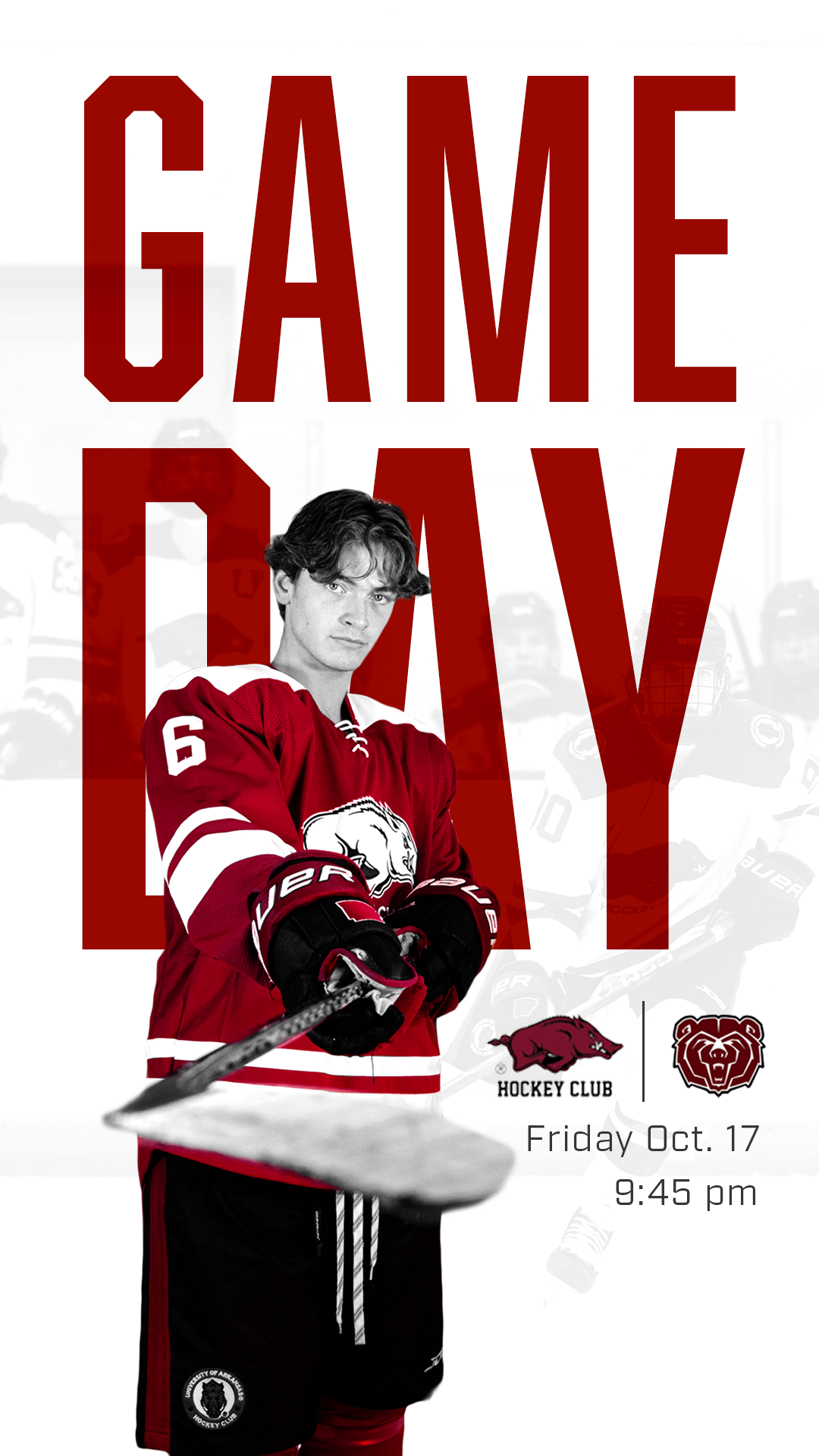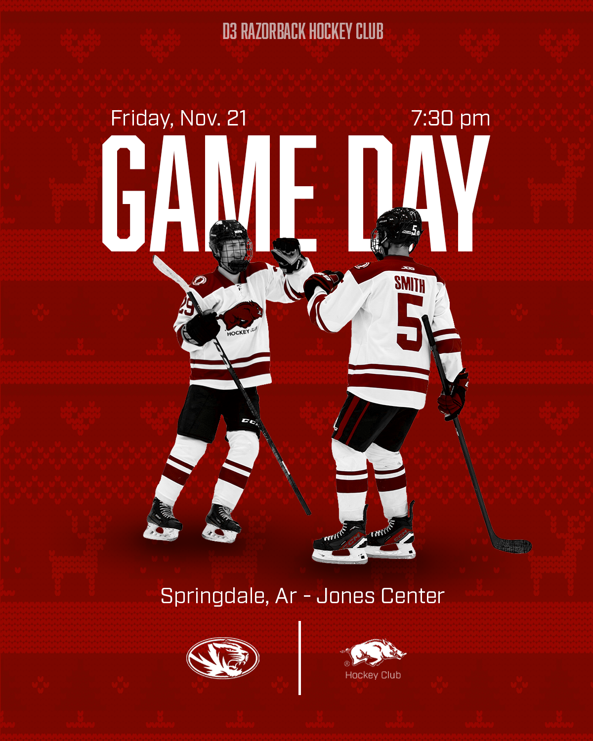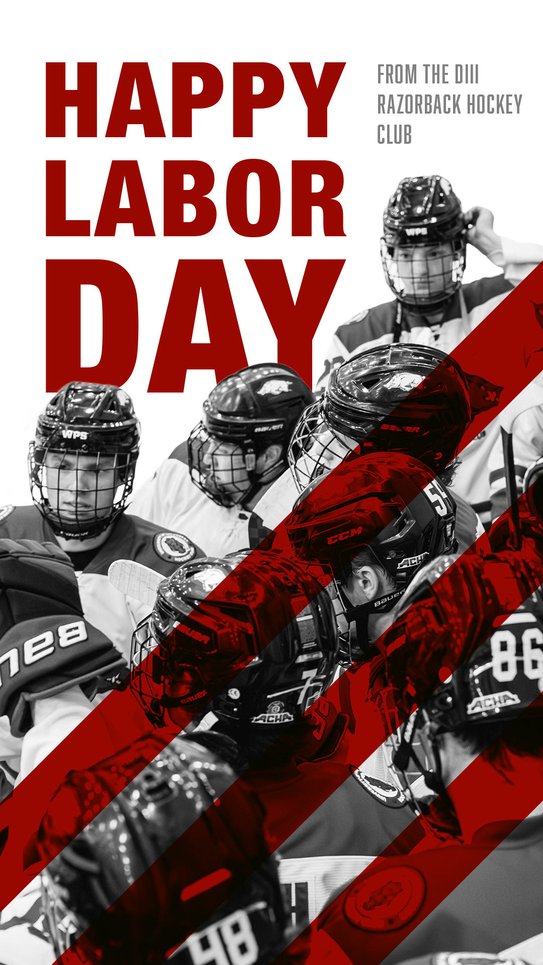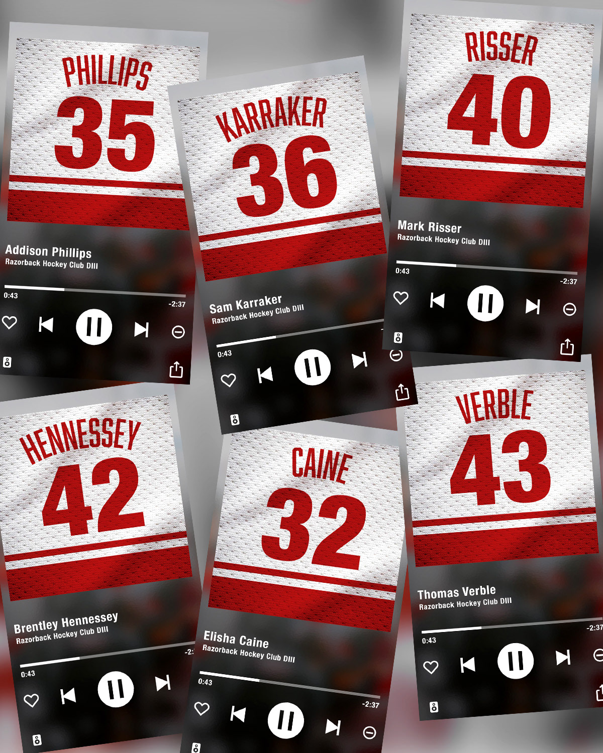 These are social media posts for the D3 Razorback Hockey Club. All game-week posts are feed posts and game-day are story posts, apart from home games which get a feed post. Along with game information we also made posts for holidays, birthdays, and other specials events that were important to the hockey club.