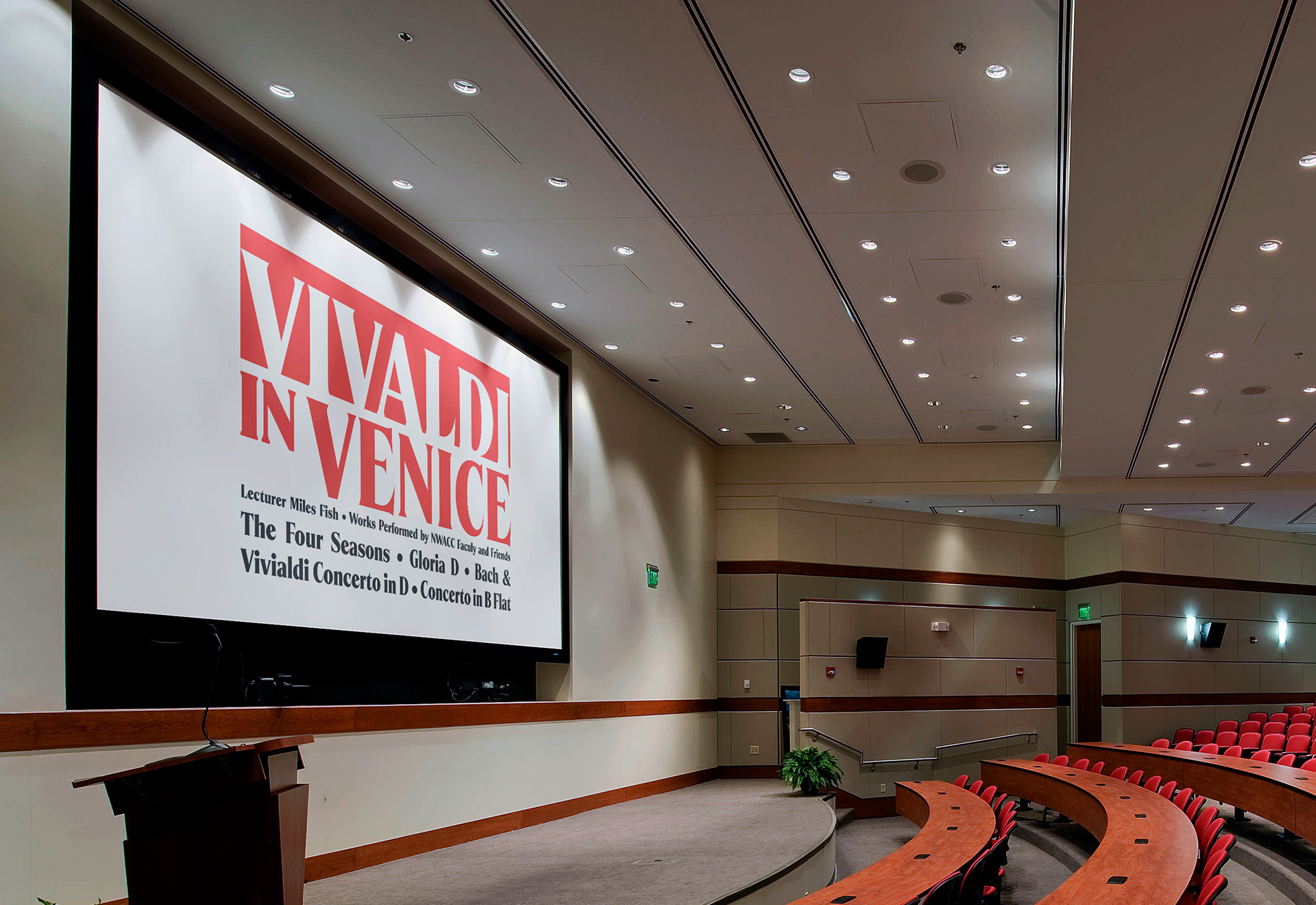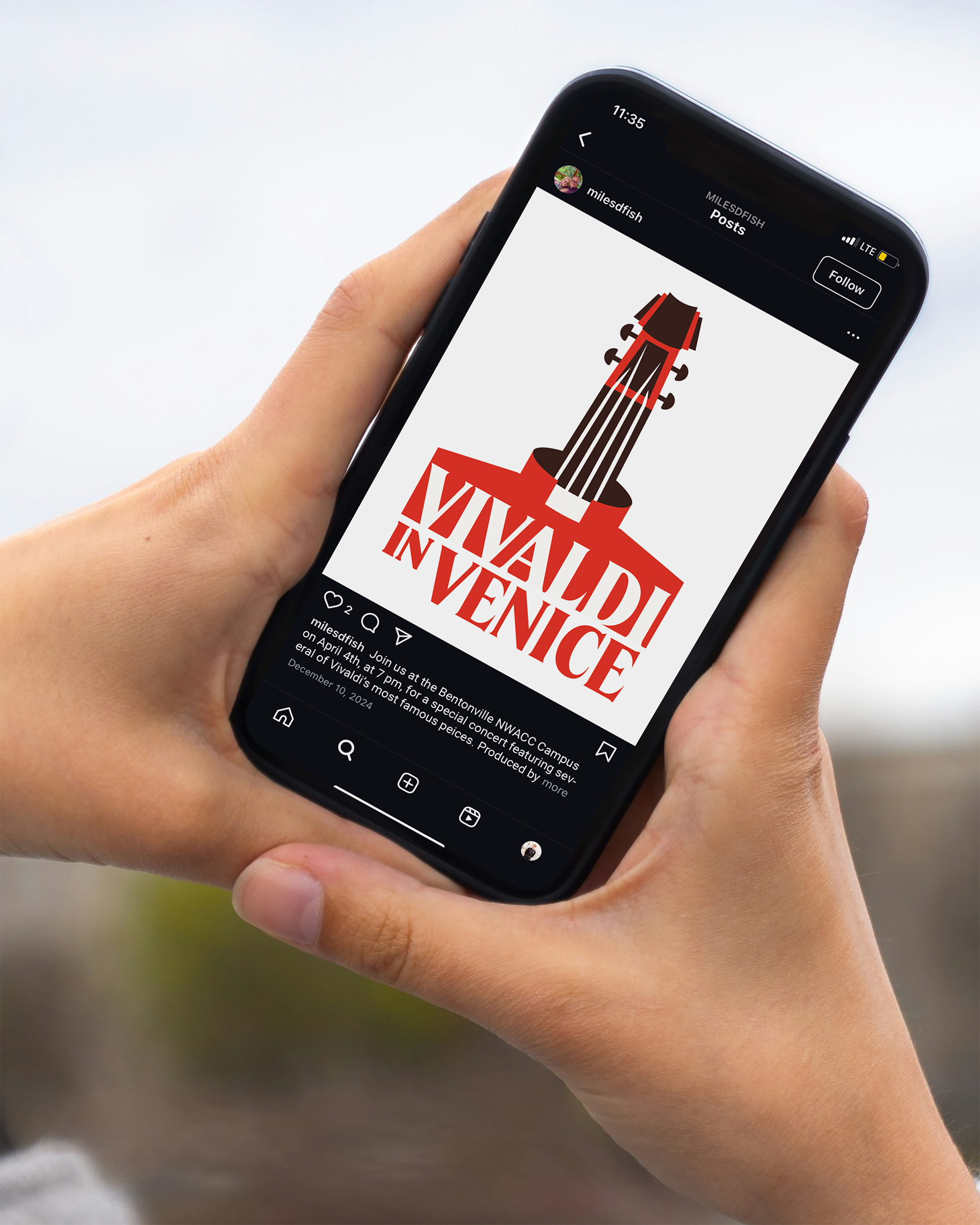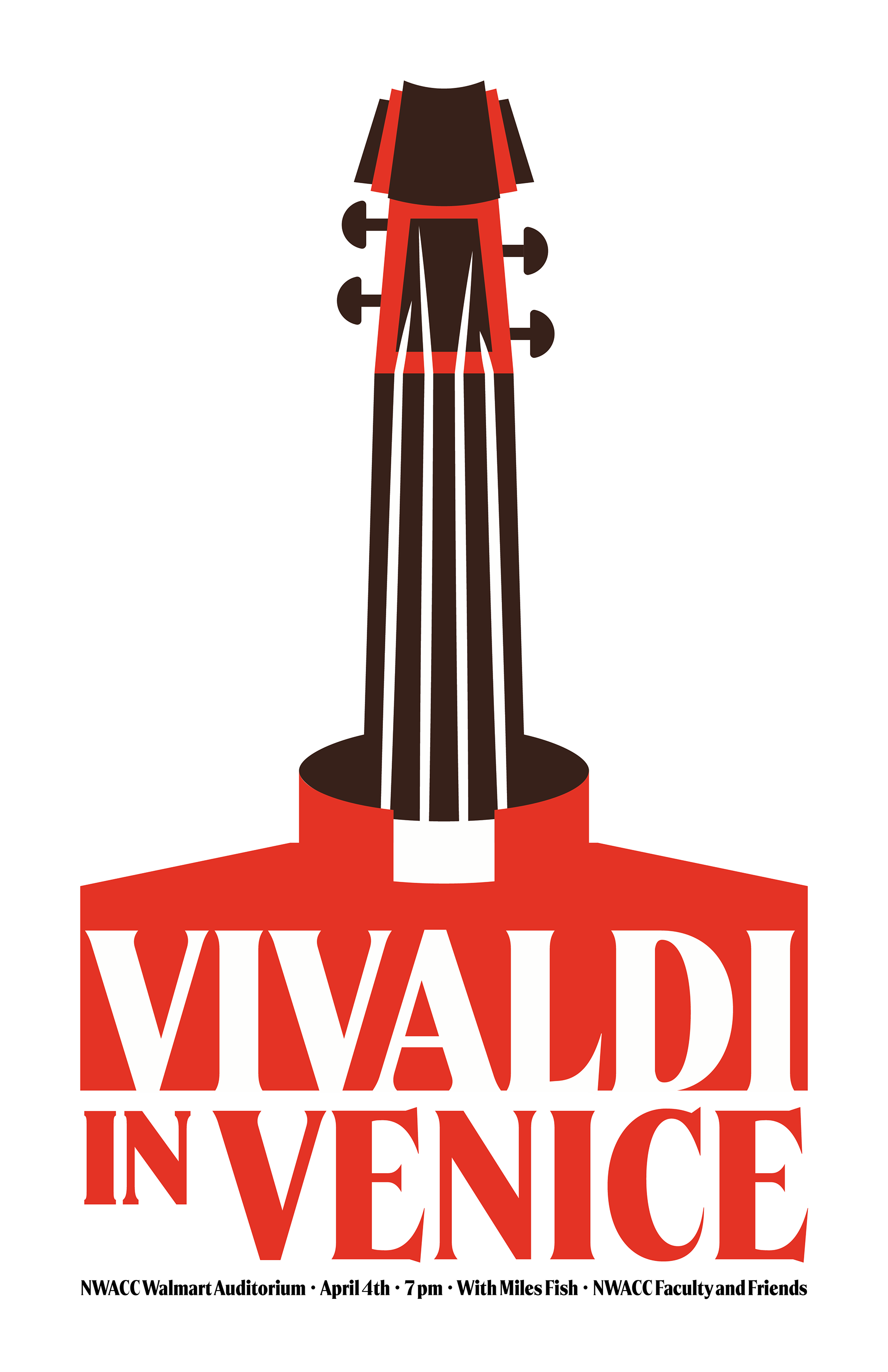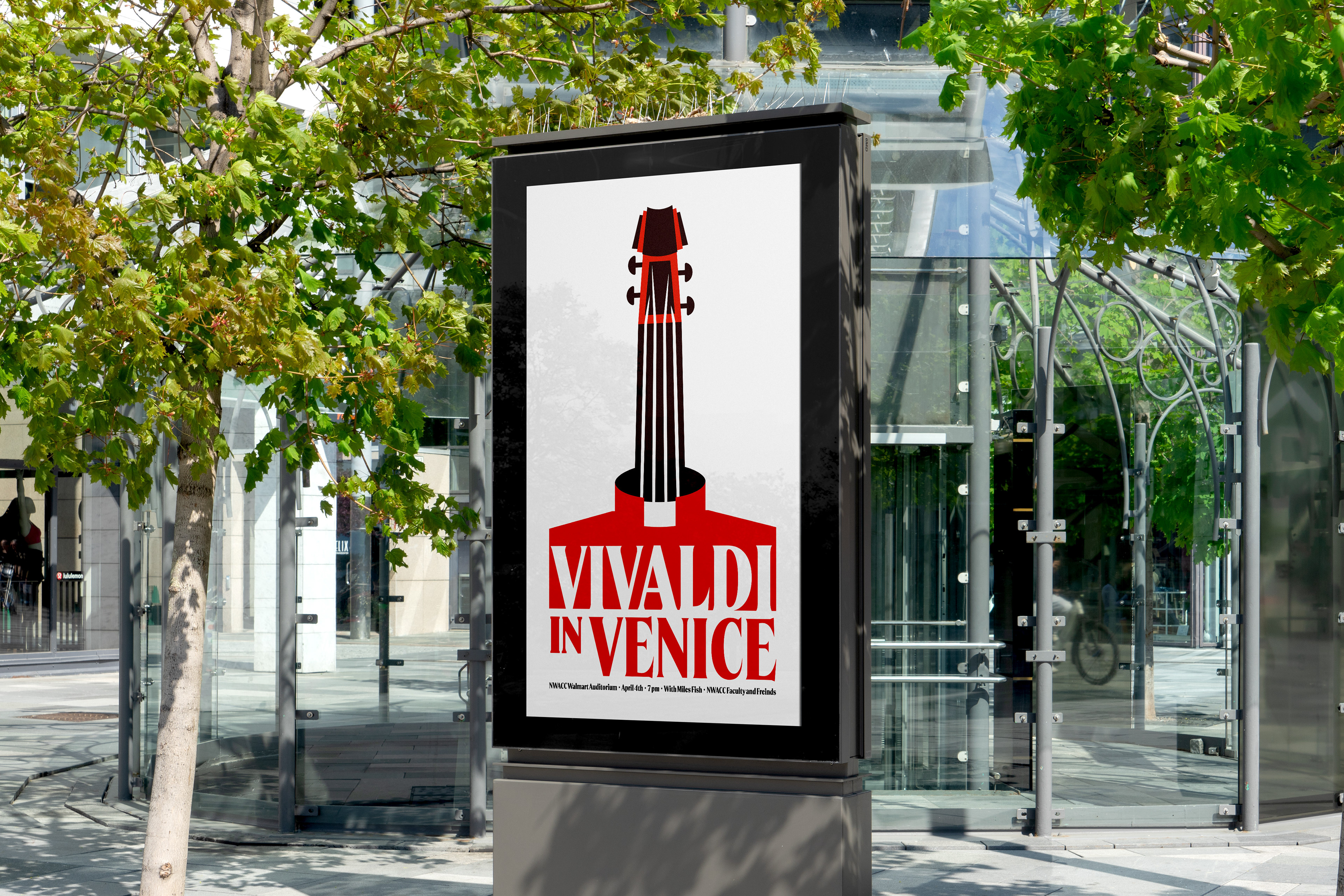 This poster advertises a lecture/concert event at NWACC. The event consisted of several Vivaldi compositions and a lecture covering his background and the research that the lecture, Miles Fish, had done in Venice. In addition to the poster, I also made an adapted version for the screen as guests came in, and a post to advertise the show on social media.